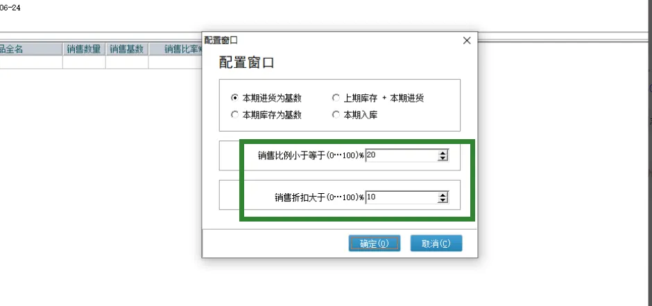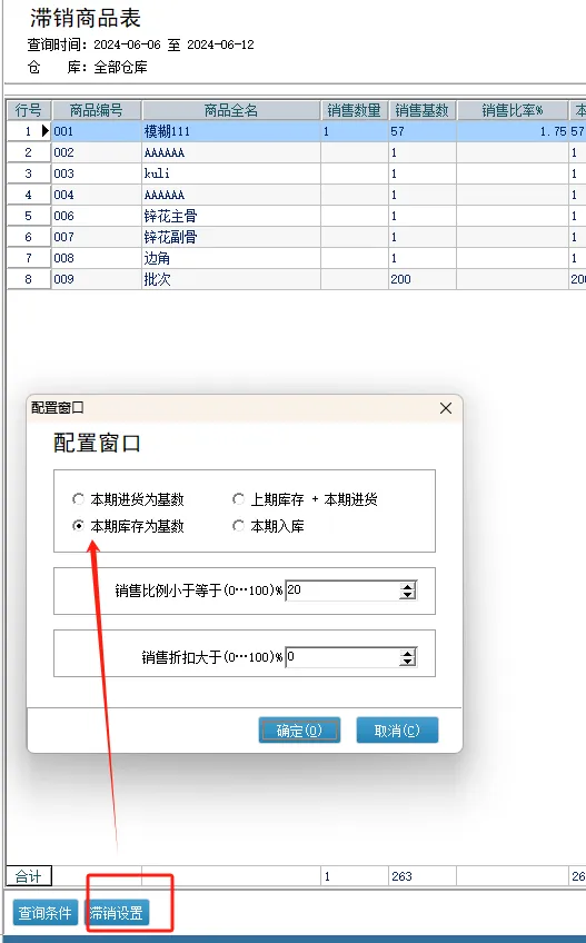 滞销设置:基数选择,包括:本期进货、本期库存、上期库存+本期进货、其它入库+本期进货等。